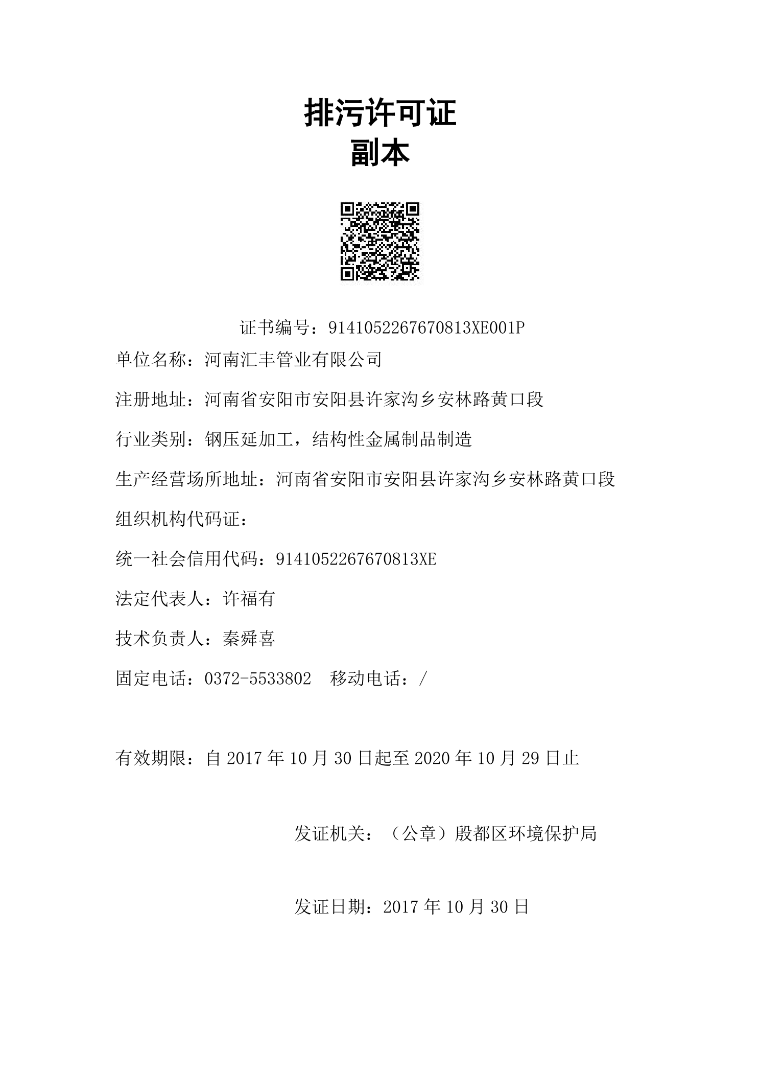 河南匯豐管業(yè)有限公司排污許可證