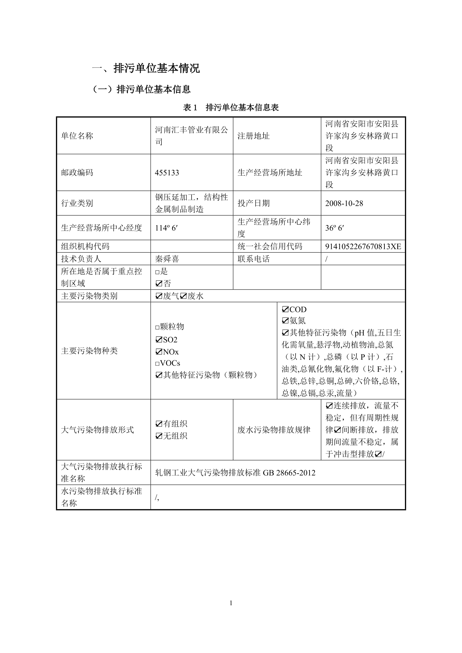 河南匯豐管業(yè)有限公司單位產生源